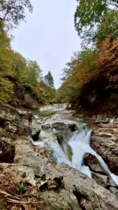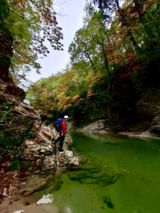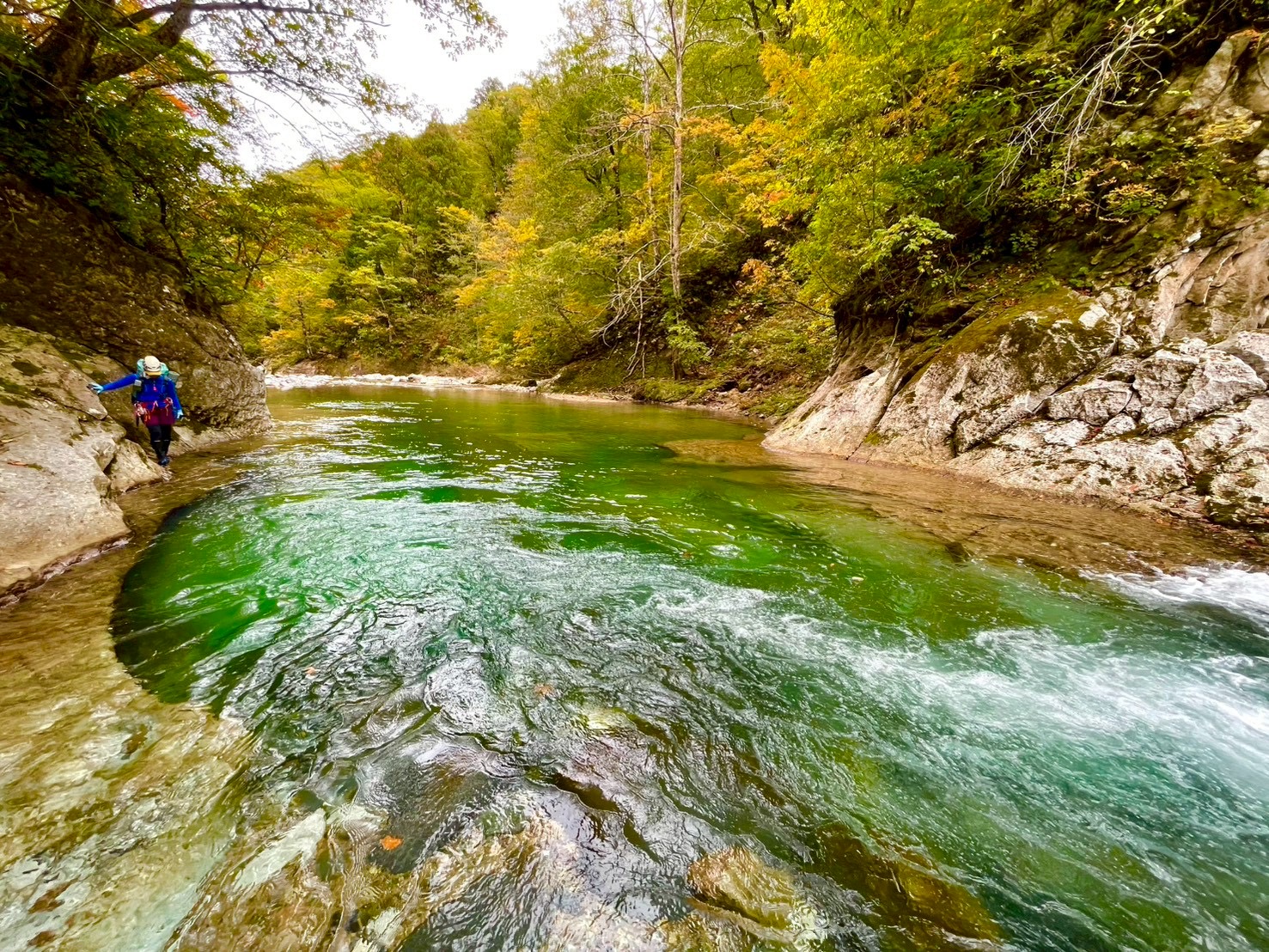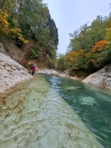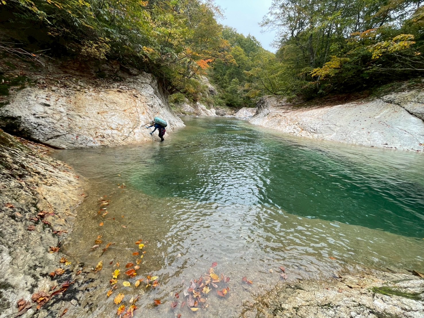 お函は、水と石で削られた少し幅広のゴルジュですが、日が差すと渕はエメラルドグリーンに輝き、その流れは前を見ても振り返っても変化に富んで感動です!