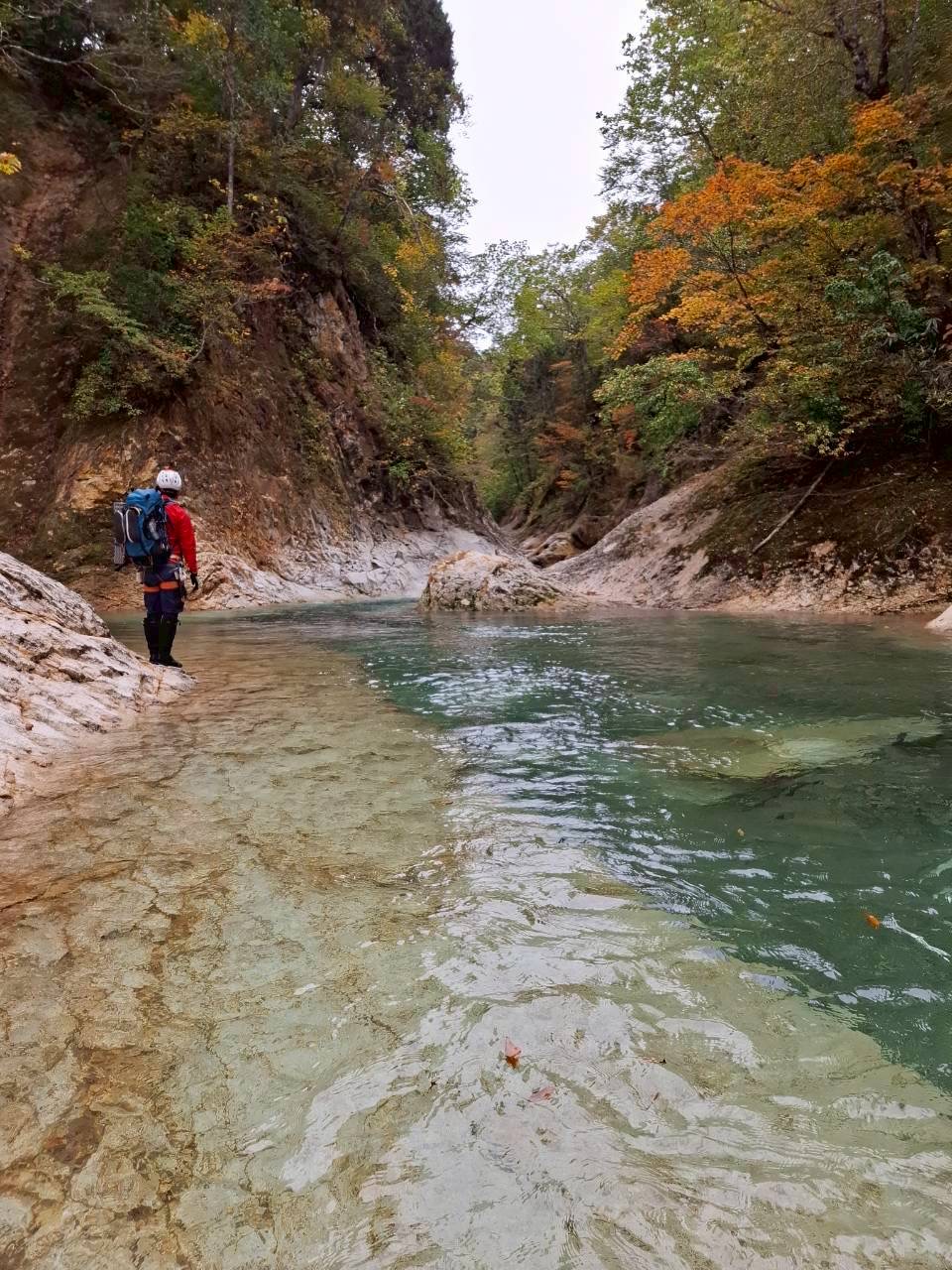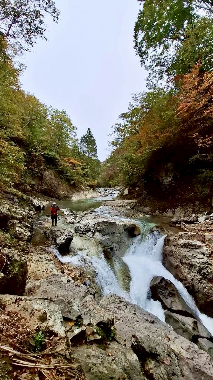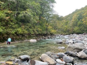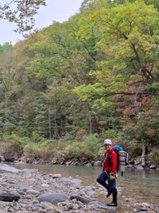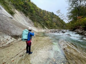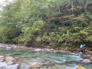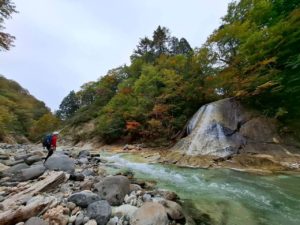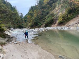 最初は、川幅が広く気温も低く曇り空なので、流れを見ながらあまり濡れない浅い場所で渡渉を繰り返します。