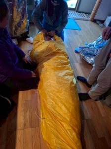 今回のテーマは低体温症です。まずは、室内で資料をもとに低体温症の知識を学んだり復習したり。
