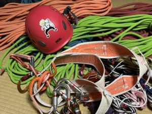 講習会では、まずロープ、ハーネス、ヘルメットなどの装備の説明をして。