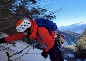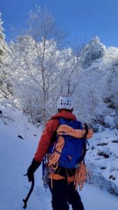 1つ目の氷瀑に着いてパートナーとロープを結びます。