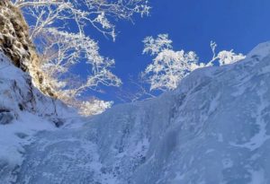 その沢には滝があって、冬の寒さで氷瀑となりアイスクライミングルートとなるわけです。