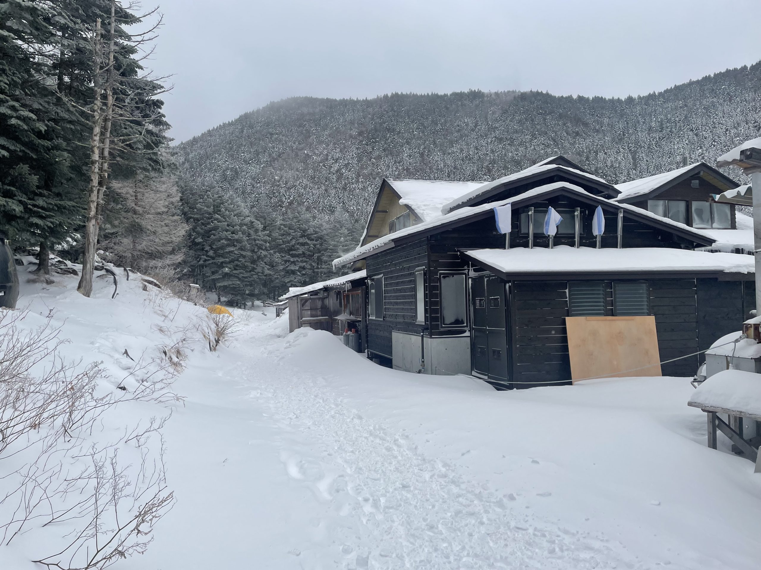 赤岳鉱泉に到着です。この日は、寒波が来る!というニュースの影響なのか想像よりも空いていました。