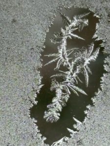 翌朝、窓ガラスにできた儚い自然の美しさを写真に収めて、外に出ると積雪が増えている。