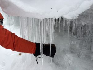 テントの内面は、鍋の湯気がバリバリに凍っていますが、シェラフの中は暖かいんです。(厳冬期用のシェラフなので!)