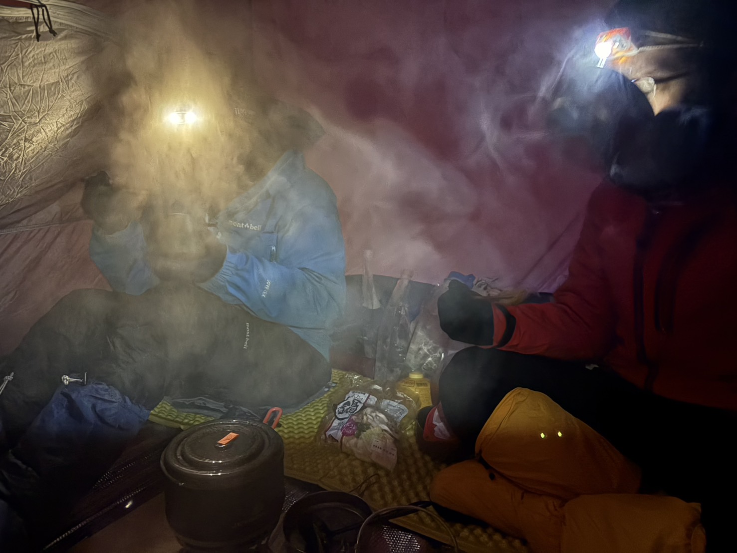 テントの内面は、鍋の湯気がバリバリに凍っていますが、シェラフの中は暖かいんです。(厳冬期用のシェラフなので!)