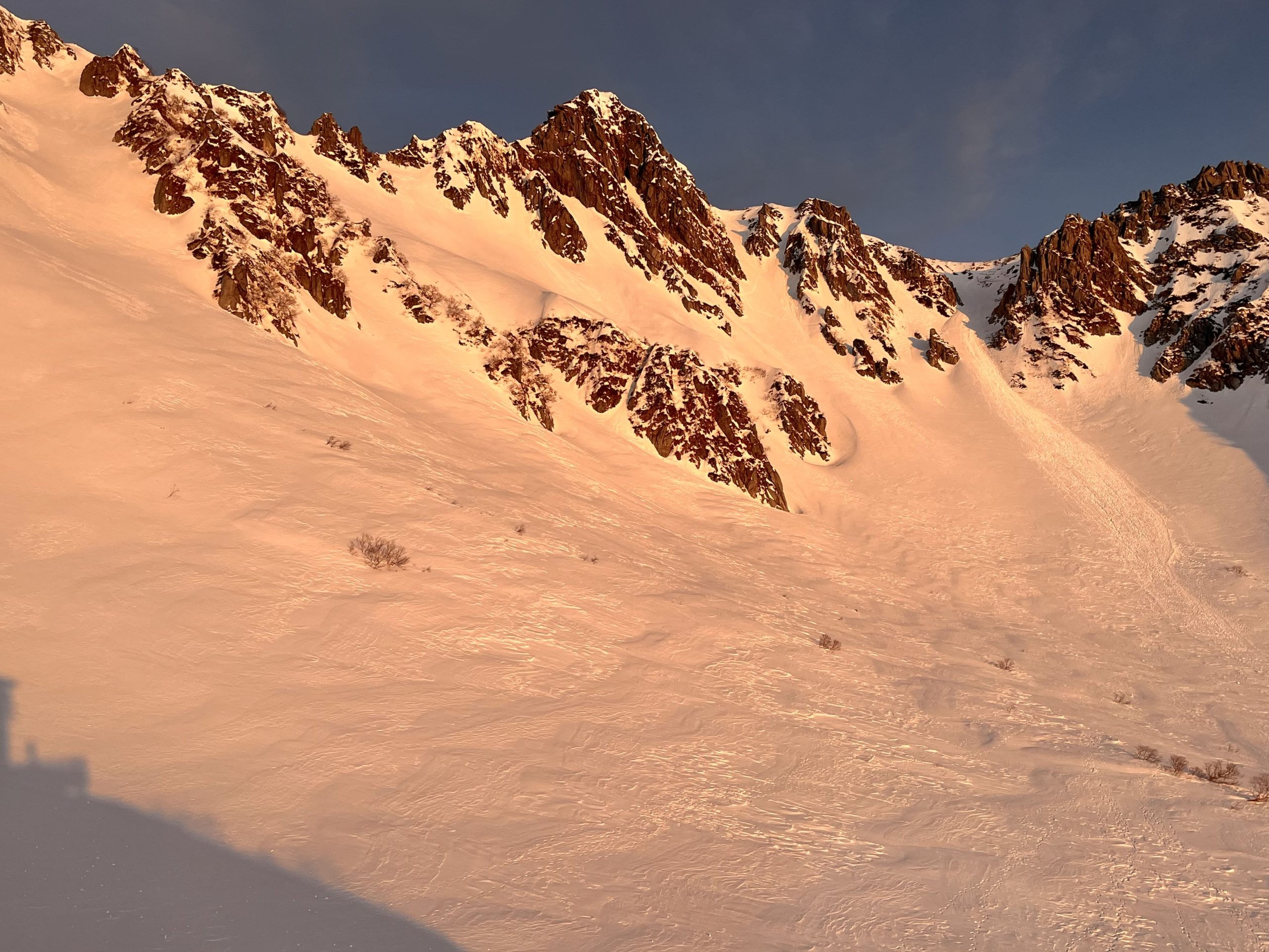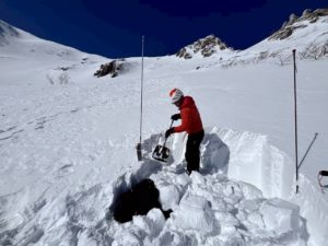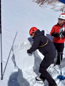 さて、フィールドでは雪崩ビーコン(アバランチトランシーバー)の取り扱い方法、ゾンデ棒の組み立てと埋没者の捜索方法、そして簡単ですが積雪断面の観察を行いました。